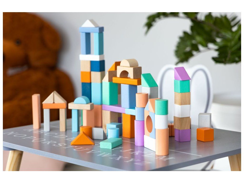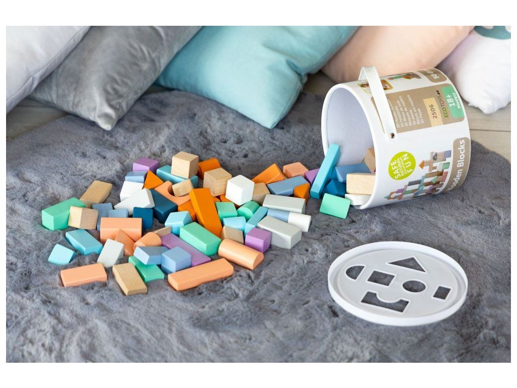 Ecotoys sada barevných dřevěných kostek v praktickém boxu. Horní plastová část má vhazovací otvory, takže dítě může po skončení hry kostky zábavným způsobem vrátit zpět do boxu. Všechny kostky mají zaoblené hrany a jsou vyrobeny pouze z kvalitního dřeva. Hra s nimi podporuje u dětí představivost a motoriku. Hračka je určena pro děti od 18 měsíců věku.