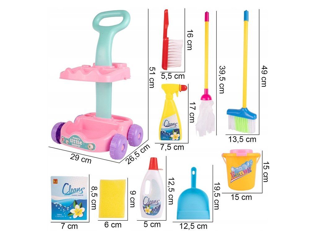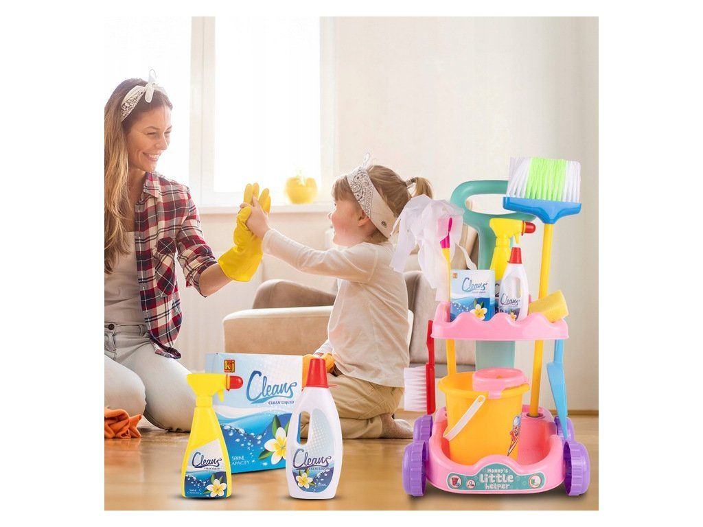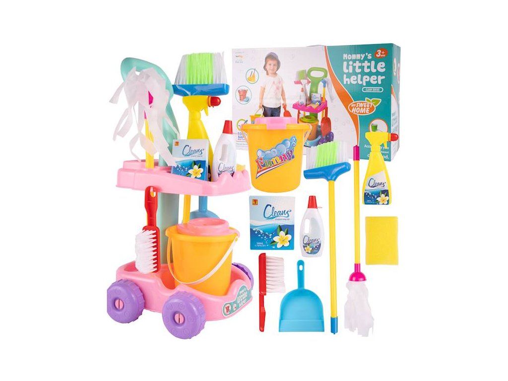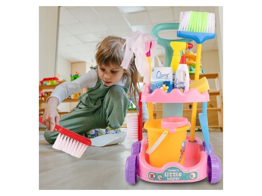 Kompletně vybavený dětský úklidový vozíček přemění Vaše dítě v opravdovou paní domu. Je vybaven dvěma policemi, velkým a malým smetákem, mopem, houbičkou na okna, imitacemi čistících prostředků a dalšími nezbytnými věcmi pro úklid. Hračka je určena pro děti od 36 měsíců věku.