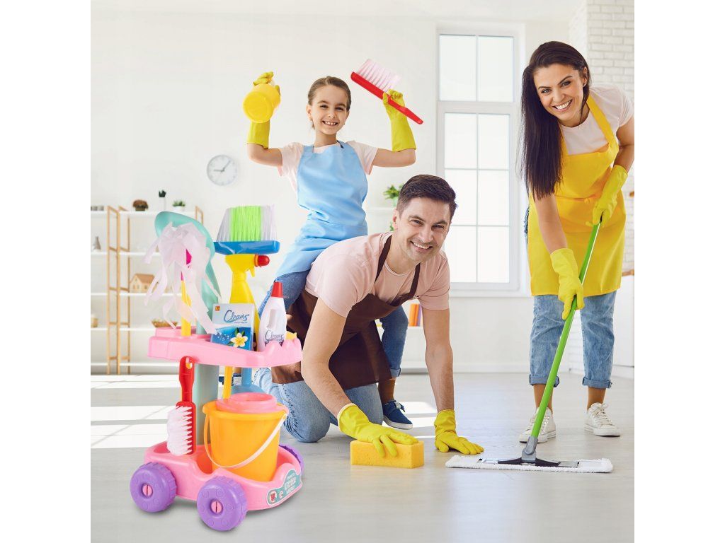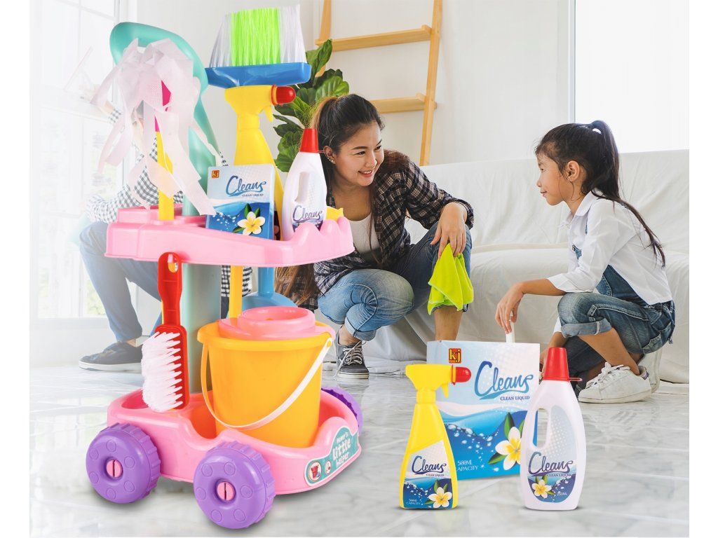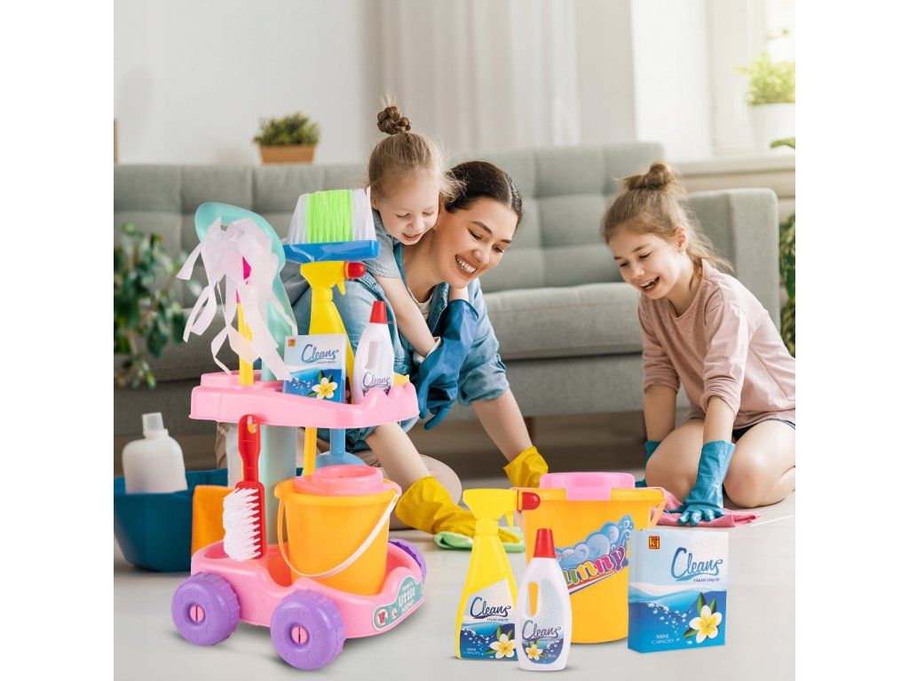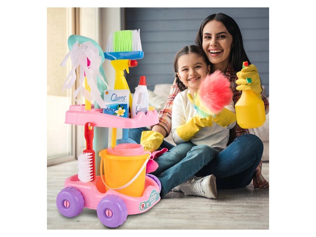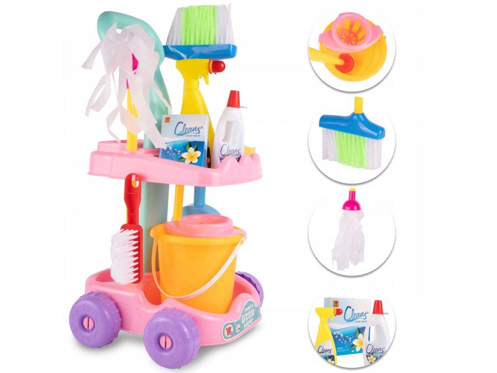 Kompletně vybavený dětský úklidový vozíček přemění Vaše dítě v opravdovou paní domu. Je vybaven dvěma policemi, velkým a malým smetákem, mopem, houbičkou na okna, imitacemi čistících prostředků a dalšími nezbytnými věcmi pro úklid. Hračka je určena pro děti od 36 měsíců věku.