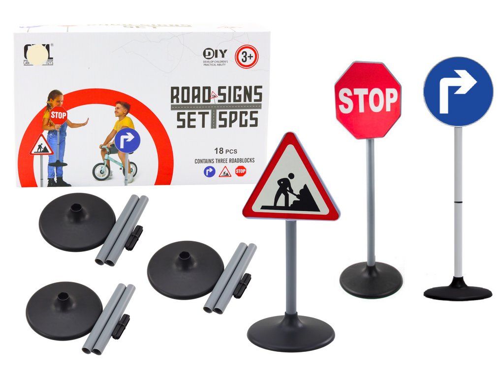 Sada dopravních značek Road Signs uspokojí každého malého řidiče. Lze je využít venku i doma. Snadno se rozkládají a můžete je rozmístit do podoby jakékoliv křižovatky nebo cesty. Dítě se s nimi snadno naučí pravidla provozu a jsou ideální pro jízdu na kole nebo v elektrickém vozítku. Hračka je určena pro děti od 3 let věku.