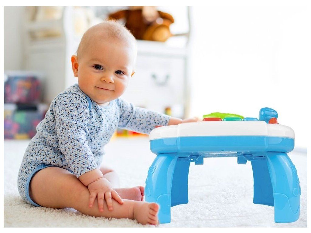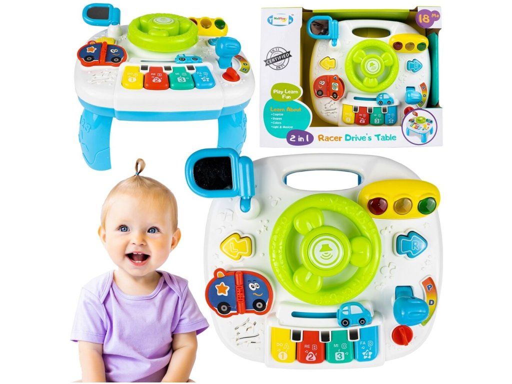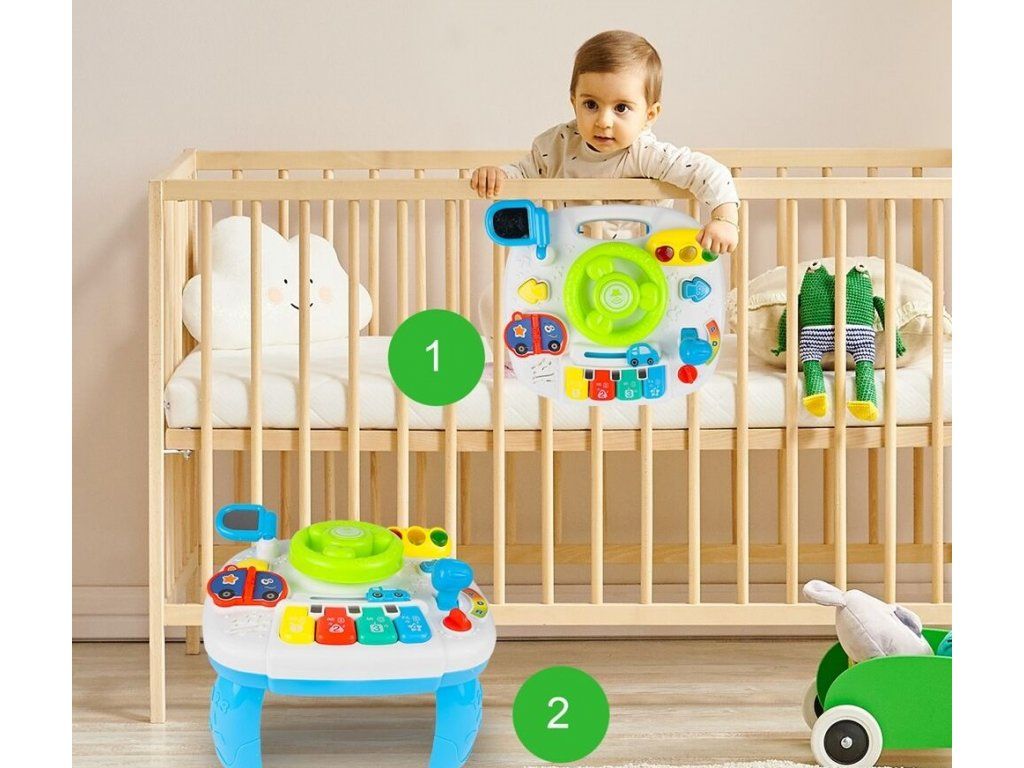 Dětský multifunkční stoleček 2v1 Drive Table určen pro ty nejmenší děti. Po vyjmutí nohou stolu může dítě hrát s panelem samotným nebo ho můžete zavěsit na dětskou postýlku nabo kočárek. Hrací deska je pokryta příjemnými barvami. Tvary stolečku jsou velmi jednoduché a zaoblené pro maximální bezpečnost dítěte. Děti se díky všem smyslům seznamují s okolním světem, a proto je důležité neustále upoutávat jejich pozornost správným a příjemným způsobem - nejlépe veselou hrou. Barevný stolek zaujme zvukovými a barevnými efekty každé dítě. Stoleček má dvoustupňovou kontrolu hlasitosti, díky níž může být hračka zcela zticha, což bude užitečné během večerní hry. Velkou výhodou stolu je kombinace všech aktivit se zvukovými a světelnými efekty, které zajímají a povzbuzují všechny děti k hraní. Tento stolek bude perfektní jak pro chlapce, tak pro dívku - hračky, které lze přesunout, jistě zaujmou každé dítě.