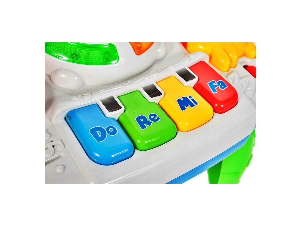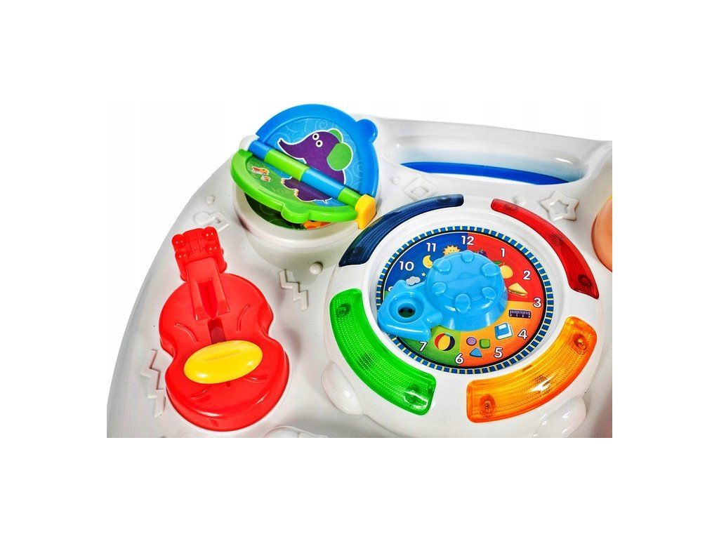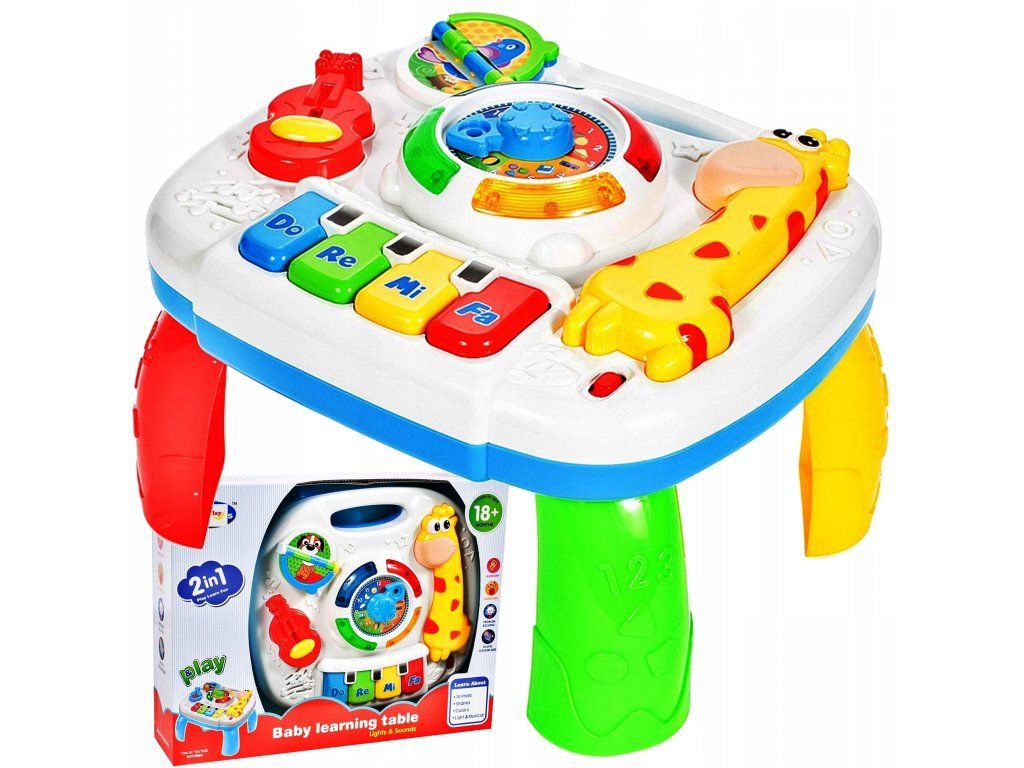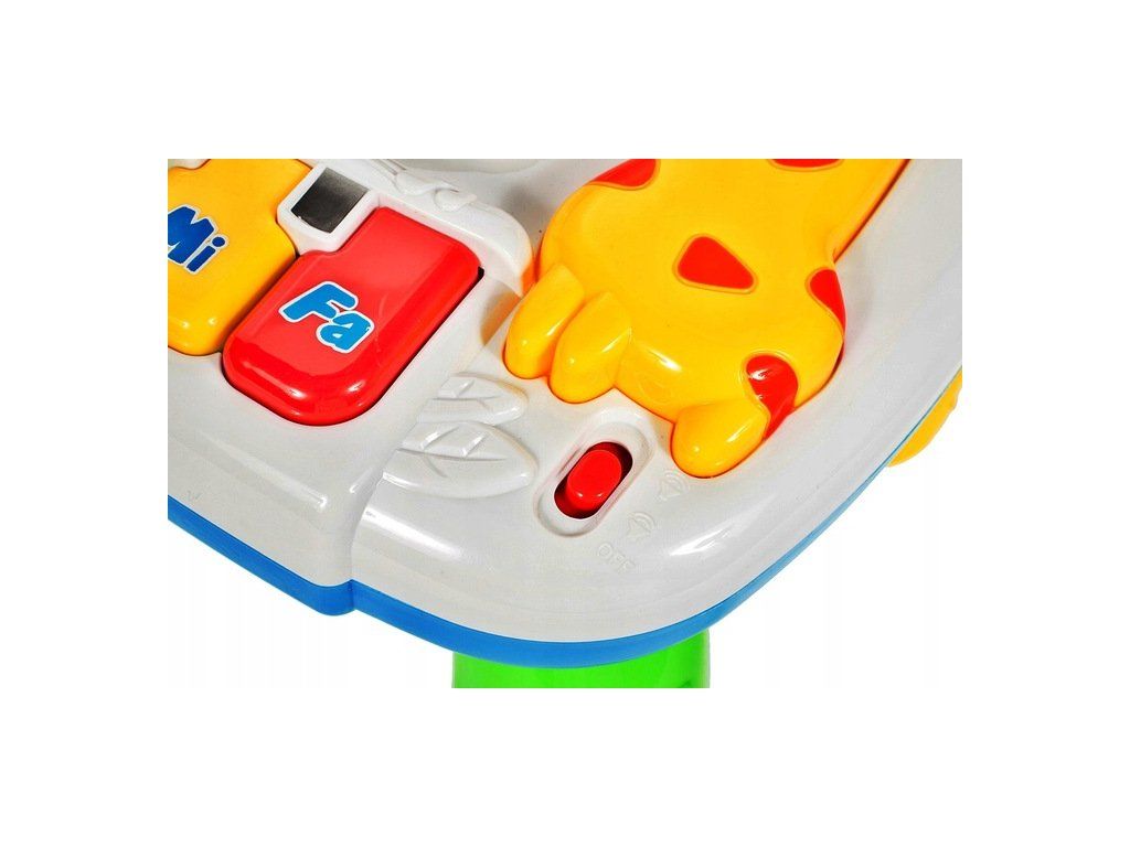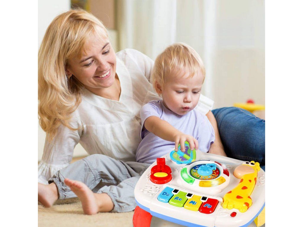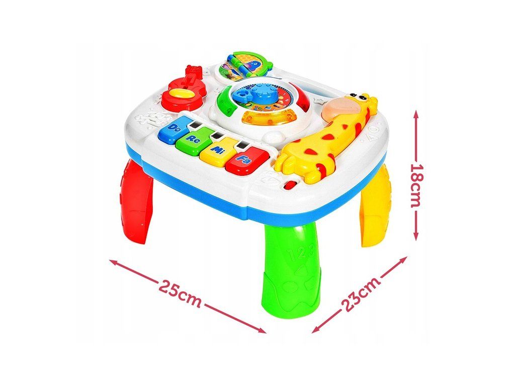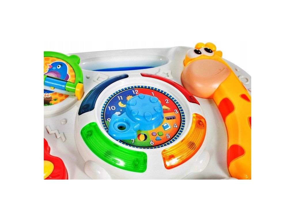 Dětský multifunkční stoleček 2v1 Žirafa určen pro ty nejmenší děti. Po vyjmutí nohou stolu může dítě hrát s panelem samotným nebo ho můžete zavěsit na dětskou postýlku. Hrací deska je pokryta příjemnými barvami. Tvary stolečku jsou velmi jednoduché a zaoblené pro maximální bezpečnost dítěte. Děti se díky všem smyslům seznamují s okolním světem, a proto je důležité neustále upoutávat jejich pozornost správným a příjemným způsobem - nejlépe veselou hrou. Barevný stolek zaujme zvukovými a barevnými efekty každé dítě. Stoleček má dvoustupňovou kontrolu hlasitosti, díky níž může být hračka zcela zticha, což bude užitečné během večerní hry. Velkou výhodou stolu je kombinace všech aktivit se zvukovými a světelnými efekty, které zajímají a povzbuzují všechny děti k hraní. Tento stolek bude perfektní jak pro chlapce, tak pro dívku - hračky, které lze přesunout, jistě zaujmou každé dítě.