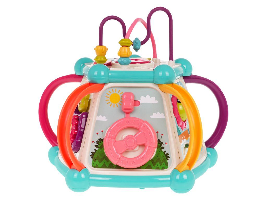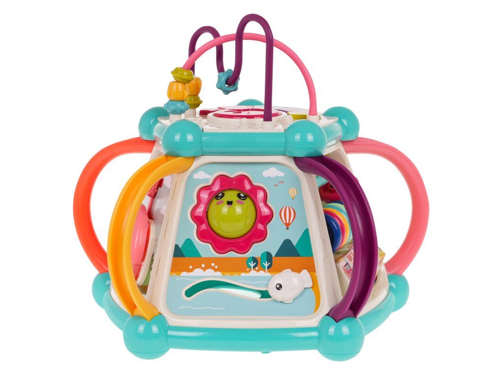 Interaktivní kostka 7v1 je určena pro děti od 6 měsíců. Vyrobena z kvalitního plastu a v pestrých barvách, které povzbuzují dětskou zvědavost a podněcují ke hře. Kostka je zcela bezpečná, bez ostrých hran. Každá ze sedmi stran kostky nabízí jinou aktivitu, která dítěti pomáhá rozvíjet manuální dovednosti, koordinaci rukou a očí a podporuje schopnost řešit problémy. Kostka je napájena 3 bateriemi typu AA (nejsou součástí balení), což zajišťuje interaktivní funkce pro ještě větší zábavu.