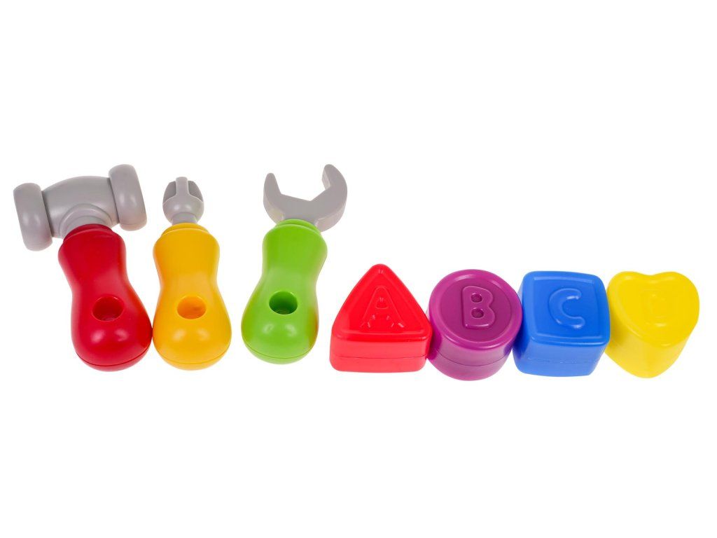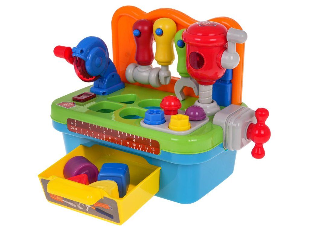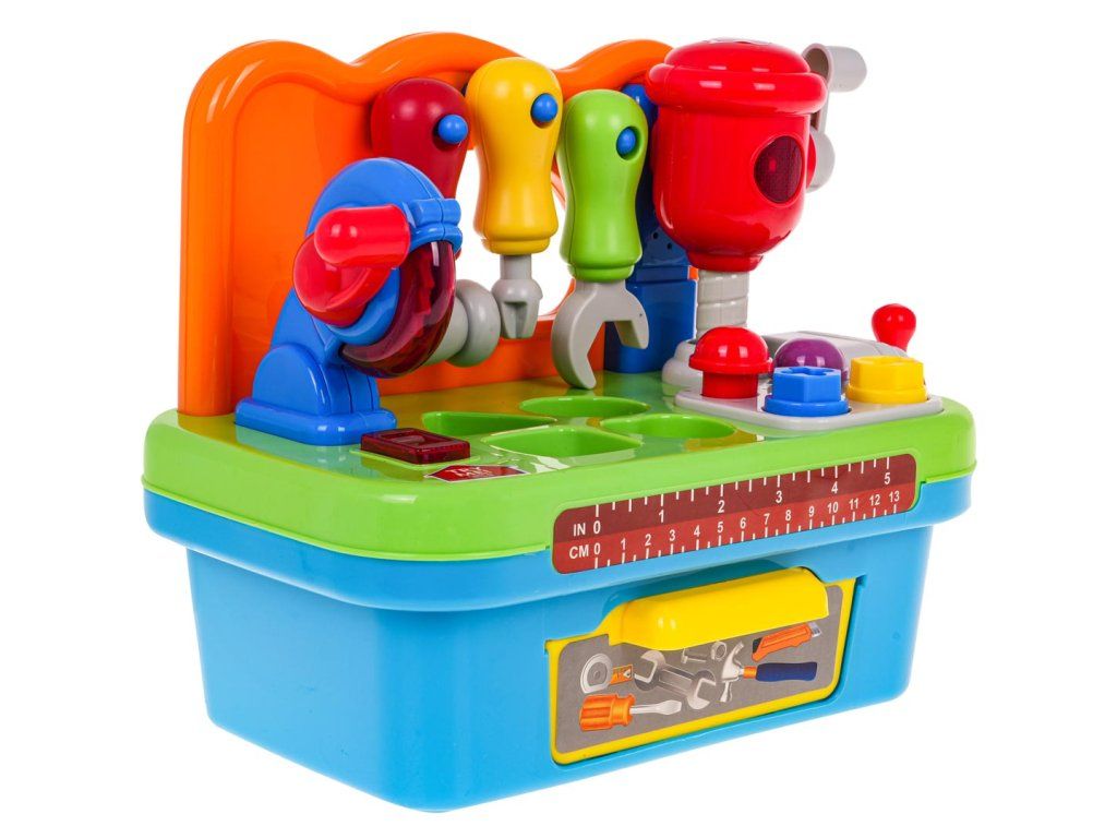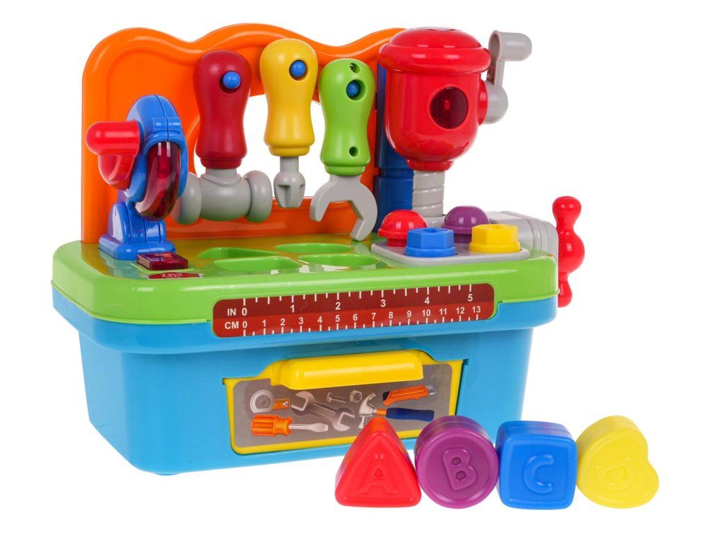 Dětský multifunkční stoleček - ponk Tool Master je ideální hračkou pro ty nejmenší děti. Dítě si na něm může "opravovat" své oblíbené hračky. Ve výbavě najděte otočnou pilu a vrtačku se světlem a zvukem, svěrák, výsuvnou přihrádku a další nářadí. Dále je stoleček vybavený prohazovacími otvory kterými lze vhazovat přiložené barevné kostky. Stoleček je ideální hračkou pro cvičení manuálních dovedností, počítání, rozpoznávání barev a tvarů. Hračka je určena pro děti od 24 měsíců věku.