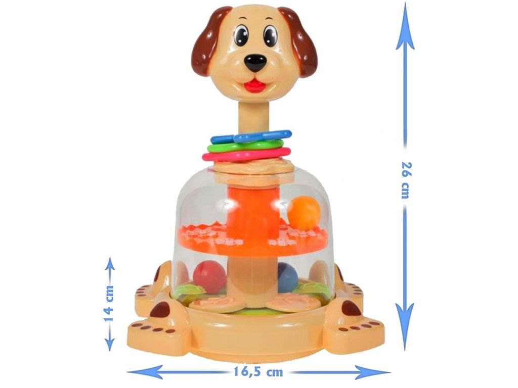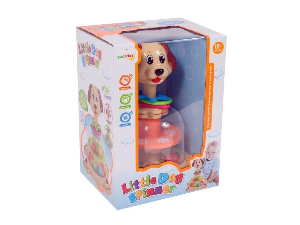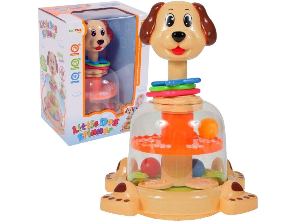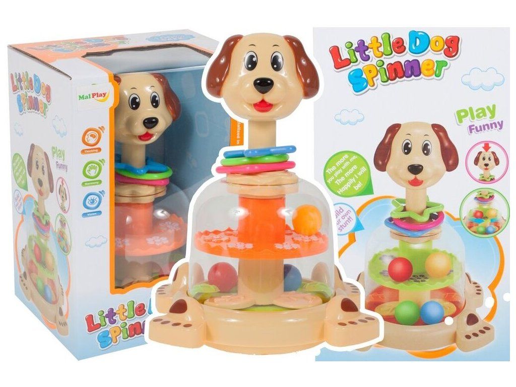Rotující hračka Dog Spinner je ideální hračkou pro ty nejmenší děti kdy jim pomůže rozvíjet logické myšlení, rozpoznávání barev a tvarů a také motorickou koordinaci. Zmáčknutím hlavy pejska se roztočí kruh uvnitř hračky, rozpohybuje kuličky a ta začnou padat do předem určených míst. Na krku pejska jsou potom umístěny obruče ve tvaru kruhu, čtverce a hvězdy. Hračka je určena pro děti od 12 měsíců věku.