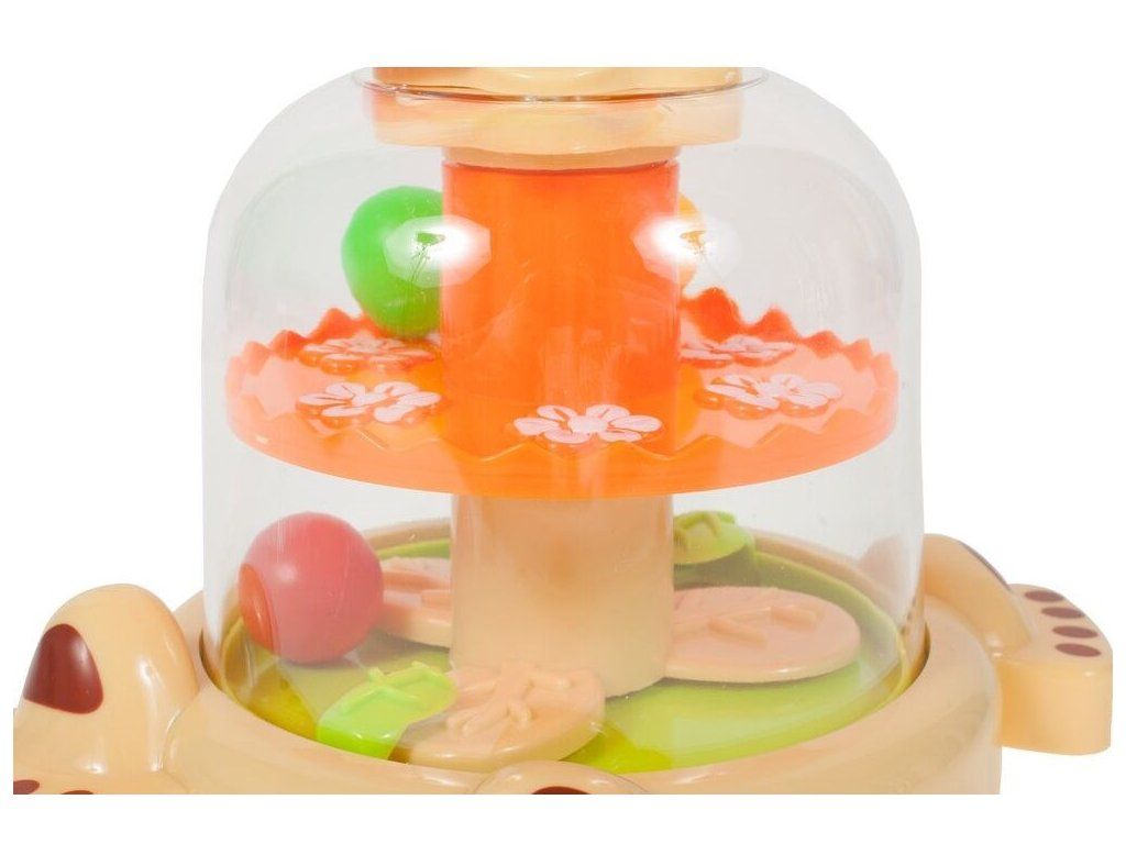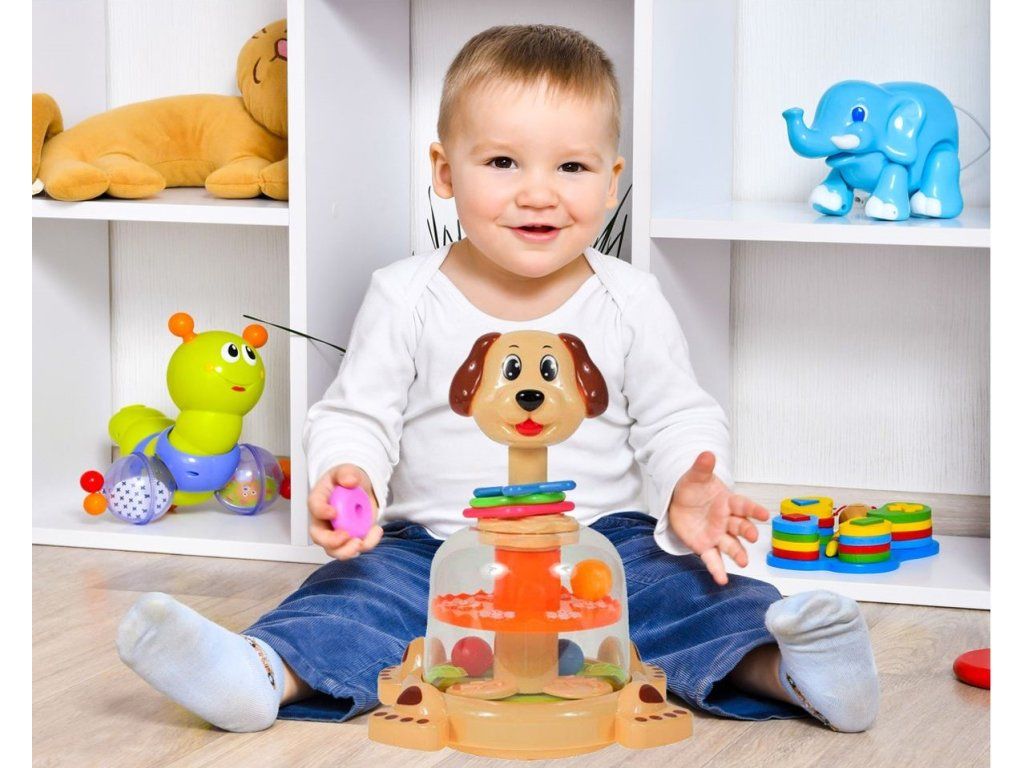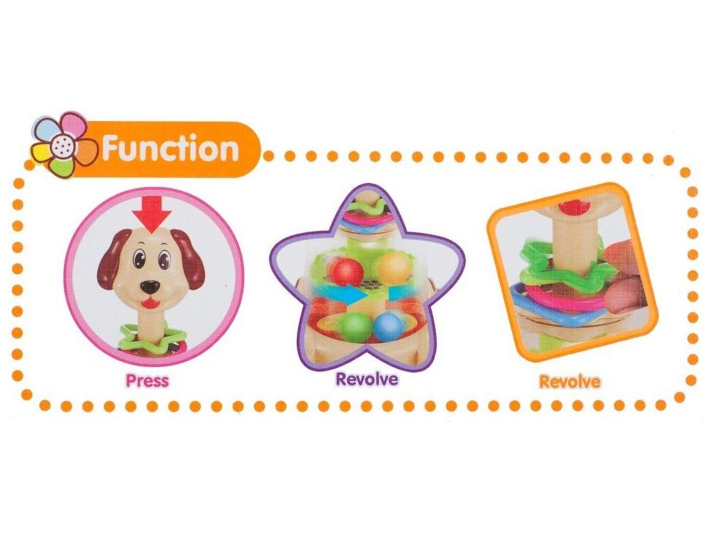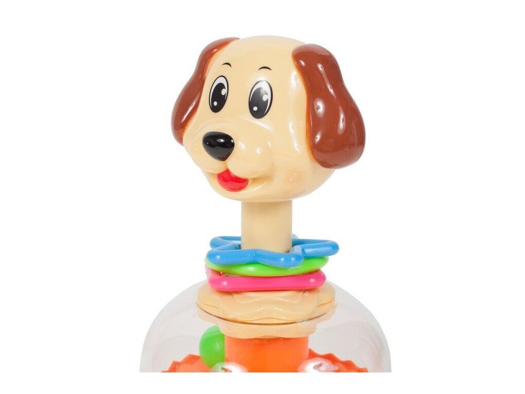 Rotující hračka Dog Spinner je ideální hračkou pro ty nejmenší děti kdy jim pomůže rozvíjet logické myšlení, rozpoznávání barev a tvarů a také motorickou koordinaci. Zmáčknutím hlavy pejska se roztočí kruh uvnitř hračky, rozpohybuje kuličky a ta začnou padat do předem určených míst. Na krku pejska jsou potom umístěny obruče ve tvaru kruhu, čtverce a hvězdy. Hračka je určena pro děti od 12 měsíců věku.