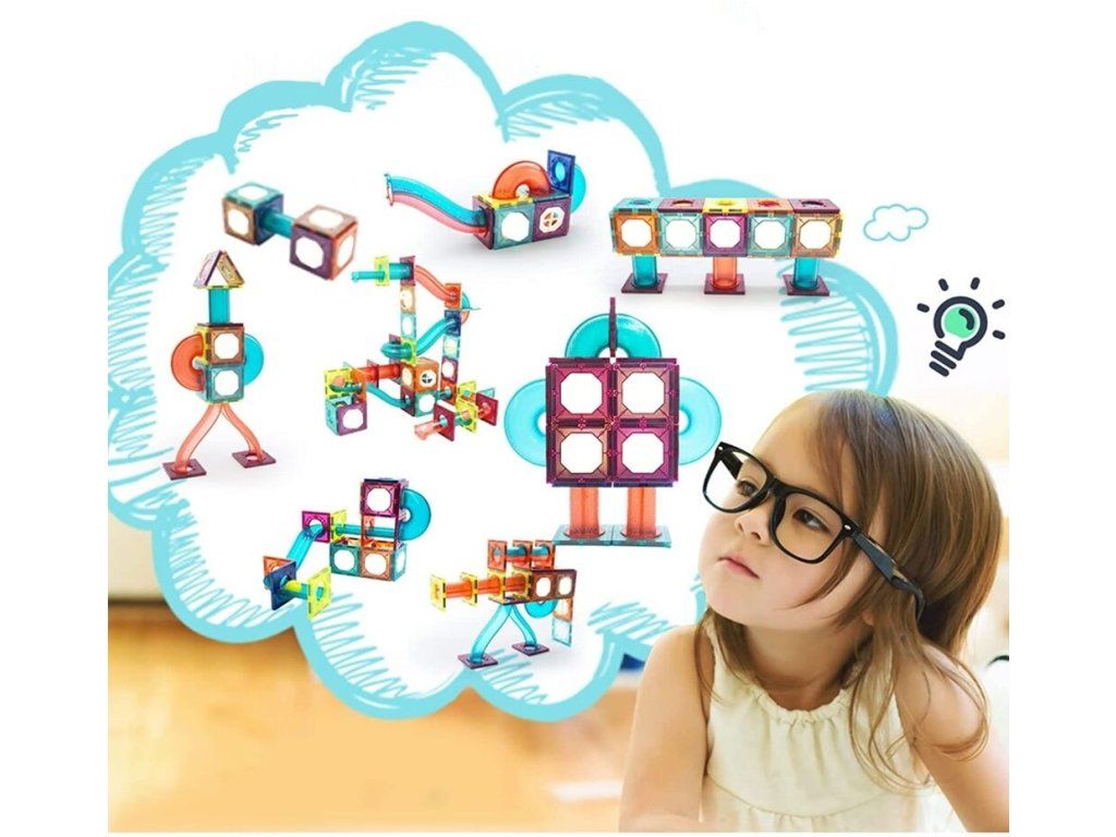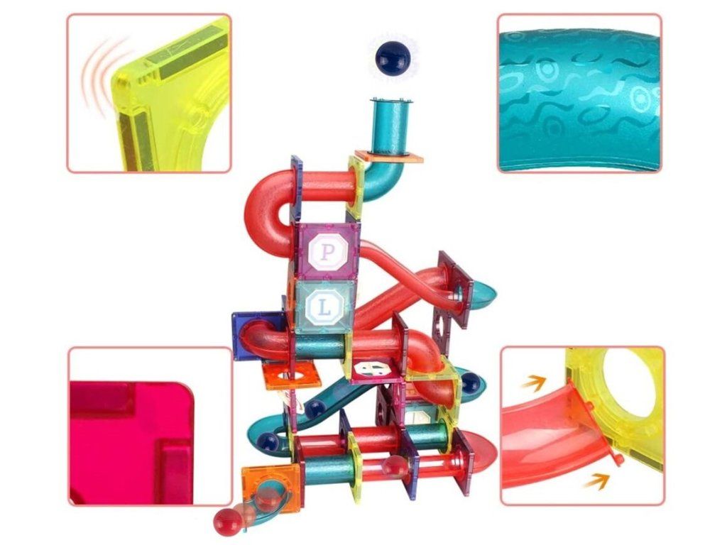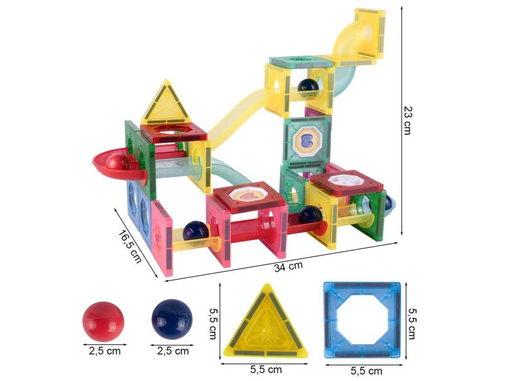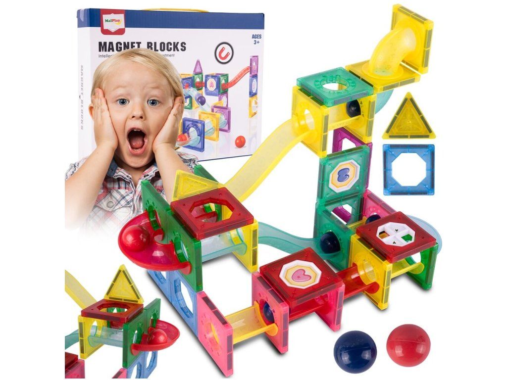 Barevná magnetická stavebnice se skluzavkou Magnet Blocks je ideální hračkou pro všechny malé konstruktéry. Skládá se z celkem 78 součástí jako jsou konstrukční elementy, části skluzavky, čtverce, trojúhleníky, obdélníky a další. Všechny součásti se velmi snadno propojují a lze z nich vytvořit velké množství plošných a 3D tvarů. Hračka je určena pro děti od 3 let věku.